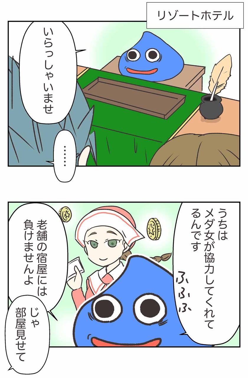 メダ女をバックに持つソルティコの町のホテルの主人。スライムなので戦闘力は低いが、宿のオーナーなので経済力はそこらの冒険者より確実に上。