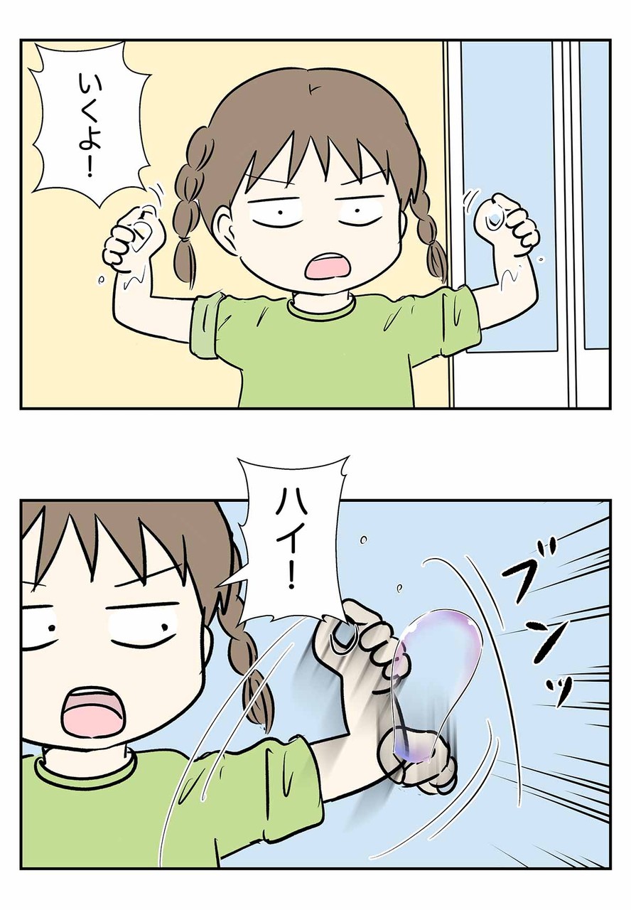これ、お風呂はいったときに石鹸使ってずっと練習していたんですよ。指を輪っかにしてブンと振って、シャボン玉を作る技術が最近上達して成功確率があがりました。