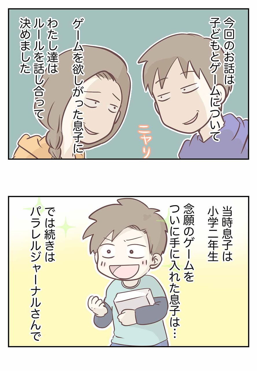 2018/02/19 【お知らせ】「俺はついに見つけた!このゲームのルールの隙を!!」って感じの第6話 パラレルジャーナルさんでの連載漫画の第6話目が公開されましたー! 記事の内容紹介 いつもの漫画よりもコマ数多めで描いている第6話目はコチラです↓ 【えむふじんの日常】子供にゲームを買ってあげたら毎朝5時起きが習慣になった話 - パラレルジャーナル | 複業で、人生を新しく。 パラレルジャーナルさんで描いた記事一覧! ありがた迷惑な旦那の家事 在宅ワーク夫婦あるある?共同作業部屋での攻防 PTA役員を巡る、ママたちの熾烈な駆け引き えむ家のバレンタインデー 〜1粒1,000円チョコレートの行方〜 在宅ワーク夫婦・えむ家の家事分担は、こちらです。 パラレルジャーナルは、最近ニュースでも話題の複業をテーマにしたウェブサイトです。 「へぇ〜」と思うことや「なるほど」と思う事など、複業に関するタメになる記事がいっぱいです。 定期的に漫画記事を描いていますので、よろしければパラレルジャーナルさんでも読者登録をしていただけると嬉しいです。 LINE読者登録 feedly読者登録 facebook読者登録 「お仕事と連載」カテゴリの最新記事 タグ :#お知らせ < 前の記事次の記事 > コメント コメント一覧 (5) 5. くろねこゆき 2021/10/05 09:49 読みたいけど読めなくなっている、と思った方は 子供にゲームを買ってあげたら毎朝5時起きが習慣になった話 と、『画像検索』すると出てくるサイトなら読めますよー😊 4. ななしさん 2021/07/26 20:53 パラレルジャーナルさんでもう見れなくなってるのが残念……(´;ω;`) 次の単行本の際に、巻末特典でパラレルジャーナルさんで掲載した漫画が入ると嬉しいです〜(*´艸`) 3. ななしさん 2021/05/06 01:30 読みたかったです😭 2. えむふじん 2018/02/20 22:13 イニさん、こめんとありがとうございます うちはゲーム好きな一家ではありますが、ゲーム漬けってほどでも無いですよ 笑 子供らの視力は普通に1.5とか2.0とかなので問題無いと思います でも、ブルーライトカットのメガネはいいですね PCの作業が多いので私が欲しいくらいです! 1. イニ 2018/02/19 19:30 えむ家はゲーム漬けな印象がありますが、子供たちの視力は大丈夫でしょうか? 目がいいことは財産だな、と大人になって痛感しています。 視力が落ちてるようでしたら遠近調節トレやブルーライトカット眼鏡をお勧めしますよ。 子供のうちの仮性近視程度なら十分回復します。老婆心ながら。 コメントフォーム 名前 コメント 記事の評価 リセット リセット 顔 星 情報を記憶 コメントを投稿する